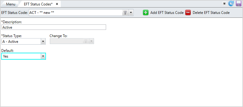 Default, choose if this EFT status code is the default status code for new bank accounts created by employers in the Employer portal. You can set only one status code as the default per status type. -