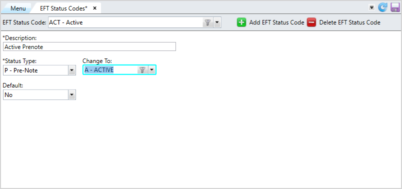 Each EFT status code is associated with one of three possible status types: pre-note, active or inactive. You can create numerous status codes of the same status type.