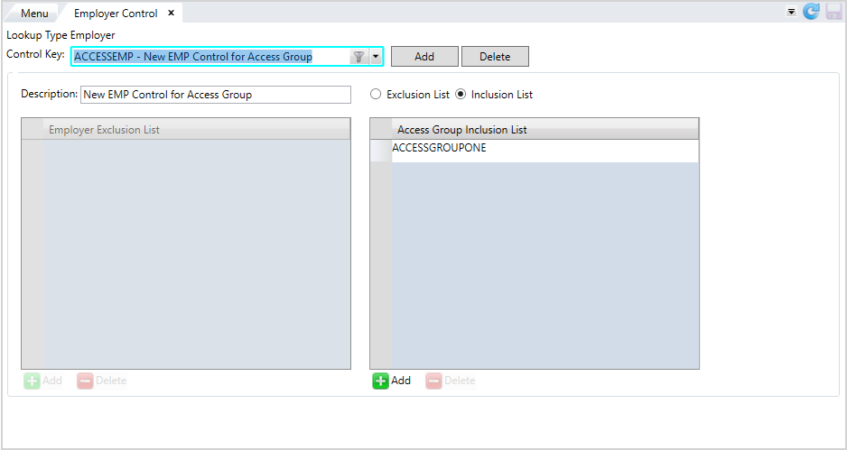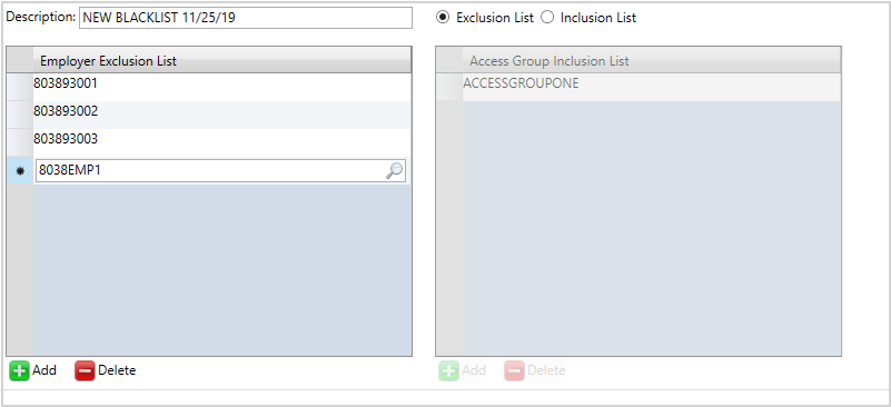 Enter a description for the employer control. Then, choose the Exclusion List to create a list of employers to exclude or Inclusion List to create a list to include.