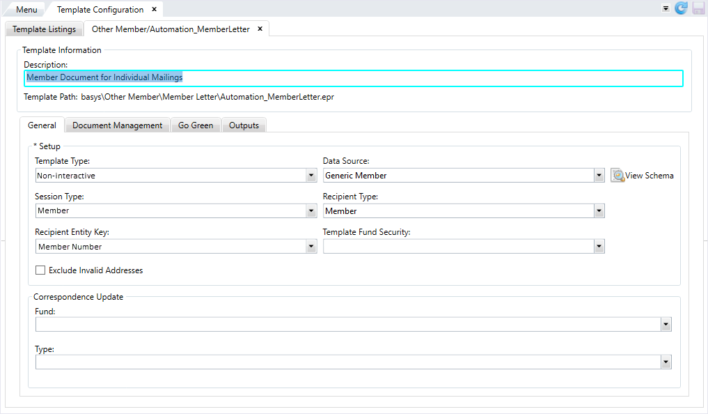 General—Update or provide the data source, session type, recipient type, recipient entity key, and any needed correspondence information. TheCorrespondence Updateinformation determines how the correspondence, if any, is recorded within theCorrespondencemodule. The operator will see these options while creating a letter. You must have active document management credentials to update theCorrespondencetab.Document Management—If you have a document management system (e.g. OnBase, PaperVision, AppExtender, etc.), set up categorization and search information for each template. You must have active document management credentials to update theDocument Managementtab.Go Green—If you have a MemberXG GoGreen solution (paperless delivery option), optionally set up email and delivery options for your members that have opted to receive email. Members will receive an email that their document is available to view in MemberXG at the delivery time you configure. If you haven't purchased the GoGreen solution, you won't see this subtab.Outputs—Define what happens to the generated statement. The options are toOutputto a PDF,Printto a printer, or send toECM Only.