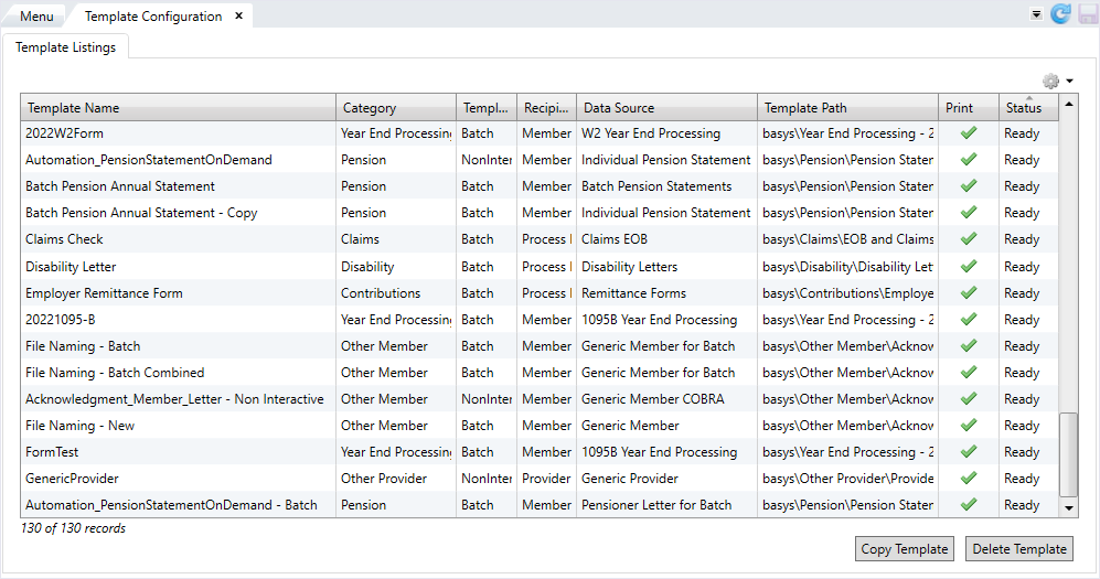 | Category | View-only | The folder in Ecrion that groups the batch, interactive, and non-interactive templates (e.g. Annuity, Claims, Dependent, Disability, Member, Year End, Other, etc.). A starter set of categories is provided with each setup. |