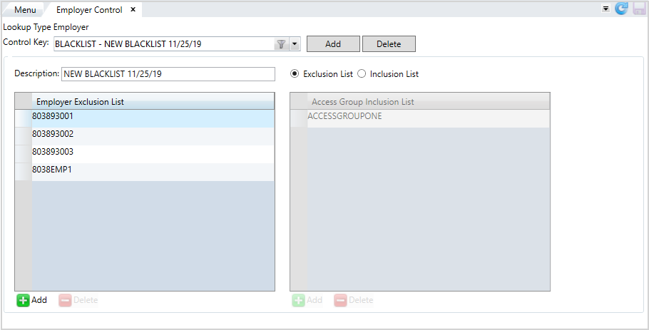 Enter a description for the employer control. Then, choose the Exclusion List to create a list of employers to exclude or Inclusion List to create a list to include.