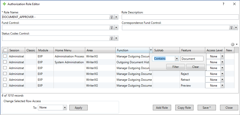 From the Authorization Role Editor, use the filter