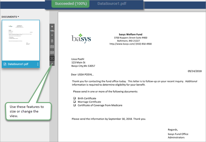 - A message at the top of the page alerts you to the success or failure of the letter generation and the file name displays. When you're done with the PDF file, close the web page.