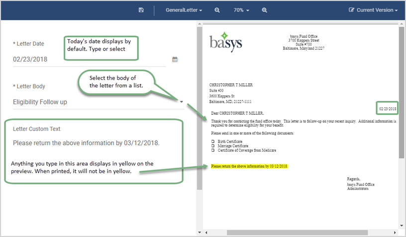 When creating an interactive document, you can preview a document (letter, statement, form, etc.) that includes basys session data and, depending on the template, you can select the letter topic or add personalized content.
